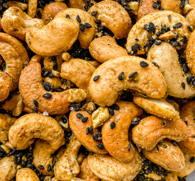 Cashew nuts (87%), salt, black sesame, cumin, coating agent: gum arabic.