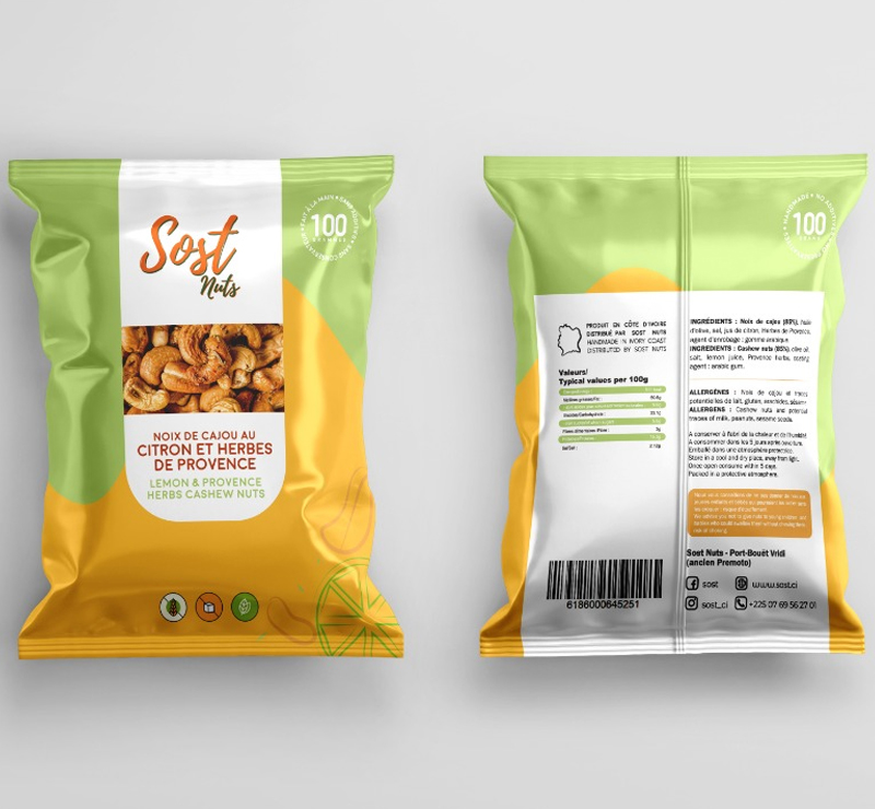 Cashew nuts (85%), salt, lemon juice, Herbes de Provence, citric acid, coating agent: gum arabic.